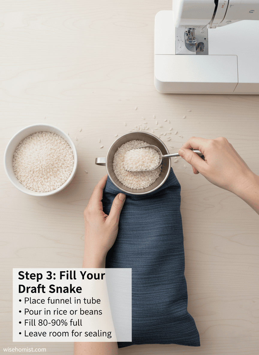 - Begin steadily pouring in your chosen filling (rice, beans, etc.). Fill the tube until it’s roughly 80-90% full. The goal is for it to be substantial and heavy, yet flexible enough to conform snugly against the base of your door.
