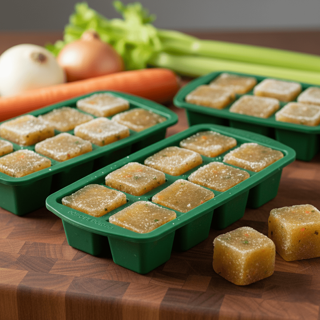 Frozen broth cubes are perfect for when you just need a splash to deglaze a pan or add flavor to rice. It lasts for at least 6 months.